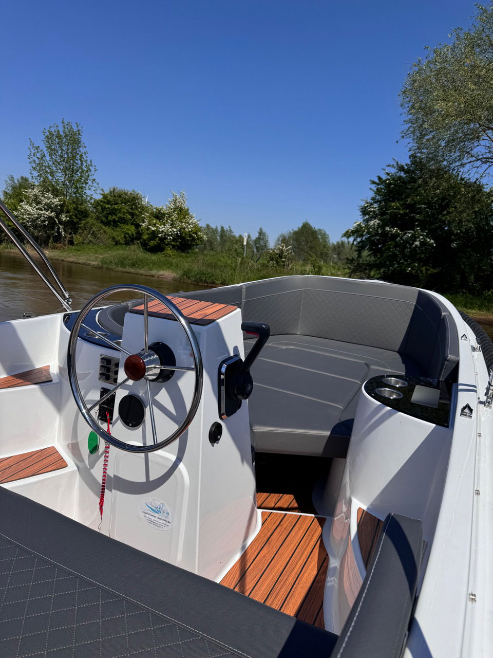 Das Ambiente der Buzzi IV ist genauso sportlich durchgestylt wie das der III und IV. Sie besticht durch ihr luxuriöses Ambiente, der geschwungenen Tauwin rings um das Boot herum, den hochwertigen exklusiven Diamant Polstern und dem schicken Steuerstand, an dem der Kapitän seinen Platz einnimmt. Vor ihm das edle große Edelstahl Lenkrad, das auch auf jeder größeren Yacht ein Hingucker wäre. Der edle Teak Boden lässt den Nizza Flair auf die Weser bringen. Das Gesamtpaket rundet das Edelstahl Bimini-Top ab, welchen der Crew auch vor den starken Sonnenstrahlen schützt. Ein Tisch und diverse Getränkehalter gehören zur Standartausstattung der Boote.