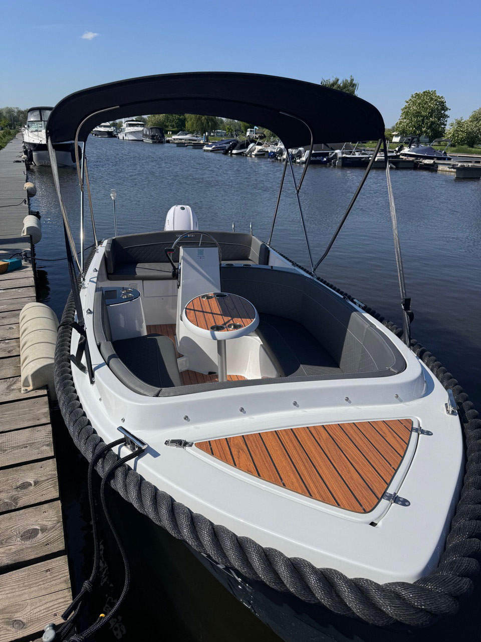 Die Szymanski punktet auch mit vielen kleinen Annehmlichkeiten. Auf Wunsch bauen wir die Sitzfläche zu einem XL-Bett um, auf dem die Passagiere herrlich chillen und sich ausruhen können, während der Kapitän sie sicher durch das Gewässer navigiert. Ein weiterer Pluspunkt ist das Sonnendach (Bimini), das sich bis nach vorne zum Bug spannt. Der dunkelgraue Rumpf macht das Erscheinungsbild der Buzzi IV perfekt.